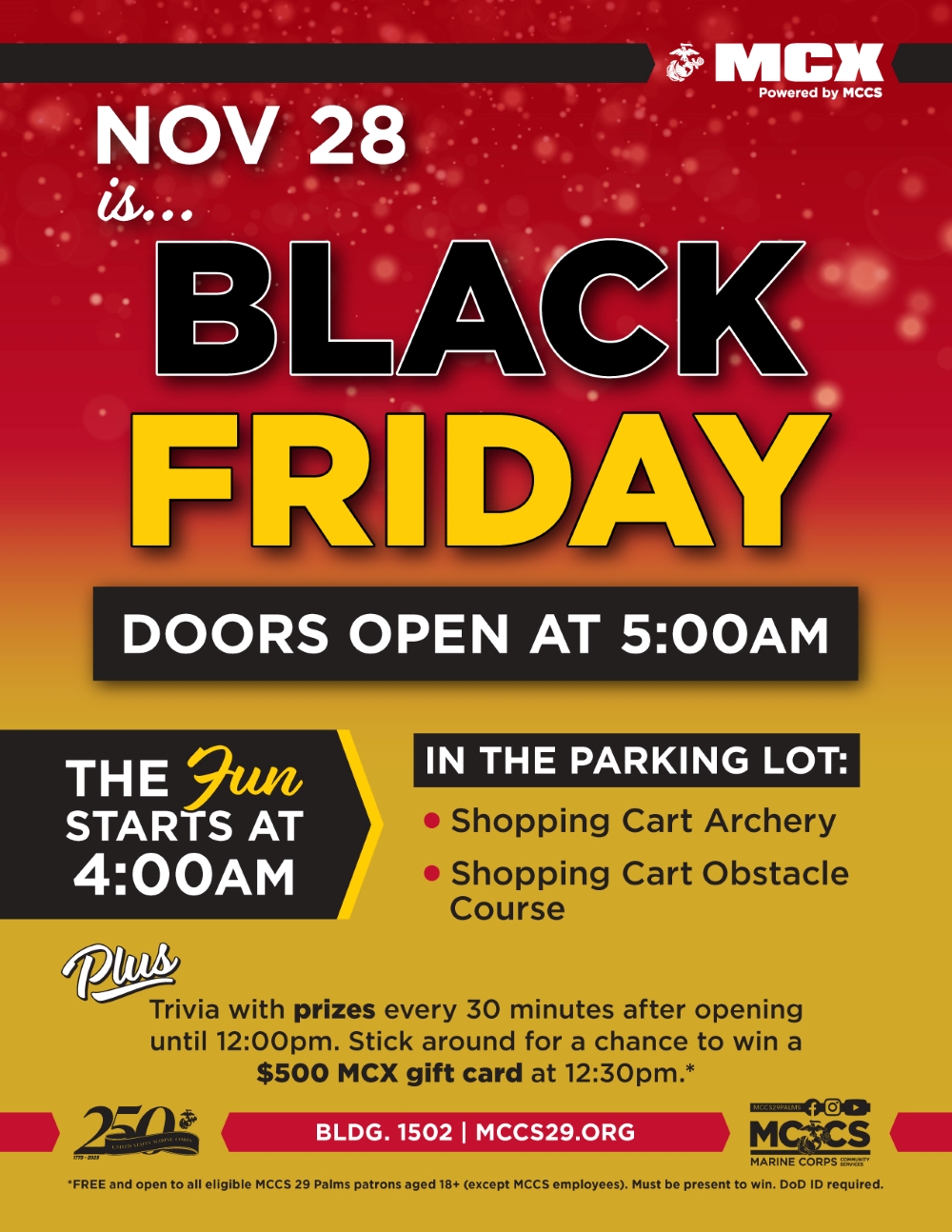 *FREE and open to all eligible MCCS 29 Palms patrons aged 18+ (except MCCS employees). Must be present to win. DoD ID required.