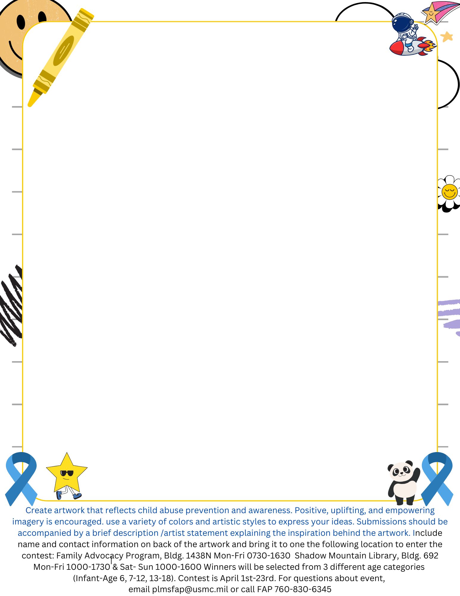 Use your creativity to reflect child abuse prevention and awareness with a variety of colors and artistic styles. Positive, uplifting and empowering imagery is highly encouraged!