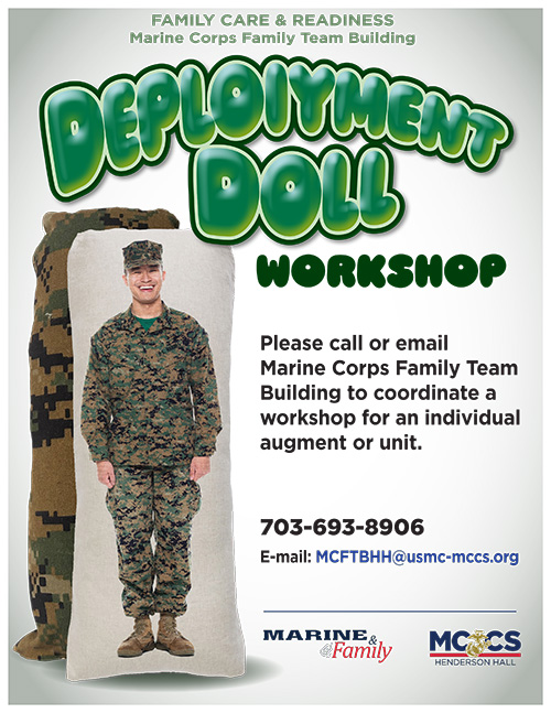 Deployment is difficult for the entire family, especially children. The Deployment Doll Workshop offers individual Marines or whole units the ability to request handmade deployment dolls featuring their service member. The intent of the workshop is to support military-connected youth of all ages with emotional challenges commonly experiences during a loved one’s deployment. By providing a tool to assist with coping, Marine Corps Family Team Building aims to support all patrons in navigating deployment with tools for preparedness, open communication, and overall success.