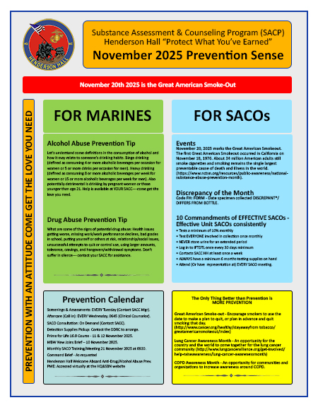 SACC Henderson Hall's commitment to our Commandant's goal of Marines “Protecting What You’ve Earned” and zero tolerance for substance abuse's destructive aspects is exemplified in our employment of a unique "SATURATION 4 THE DURATION” prevention and outreach strategy. It is further supplemented by the use of effective intervention modalities within a therapeutic framework-with special emphasis on self-worth and personal growth.