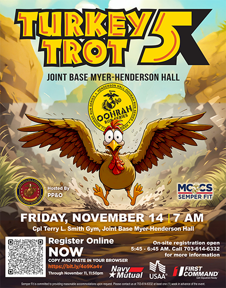 Turkey Trot 5K Race Friday, November 14 • 7:00 am • Cpl Terry L Smith Gym, Henderson Hall. The 2025 OohRah Run Series at Henderson Hall is proudly hosting the 2025 Turkey Trot 5K. The race will begin across from Terry L. Smith Gym and take runners through all of the sights of Joint Base Myer/ Henderson Hall and end back at Smith Gym for our Post Race Awards Ceremony. The first 100 ticket holders are eligible to receive a Free race T-Shirt. T Shirts first come first served on race morning. Registered participants are eligible to compete for our top awards. Top 3 in the Male/Female divisions 14 years and up will receive a medal. Top 3 in 50+ Male/ Female will receive a medal. Top 3 in the youth division 13 and under will receive a trophy. This year participants will be eligible for the award in the category they register. On- site registration will be available the day of the race from 5:45 to 6:45 am. On Behalf of Marine Corps Community Services & Semper Fit we welcome you to be a part of our healthy lifestyle events and compete with your fellow friends, family and Service Members! This race is hosted by PP&O. For more information, please call 703-614-6332. Registration is now open. Register here by November 11, 2025