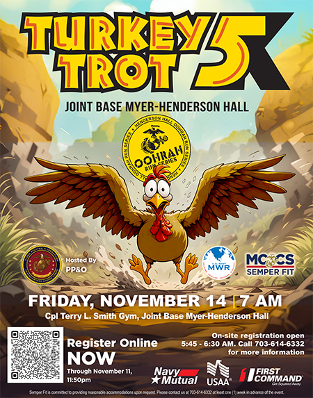 Turkey Trot 5K Race Friday, November 14 • 7:00 am • Cpl Terry L Smith Gym, Henderson Hall. The 2025 OohRah Run Series at Henderson Hall is proudly hosting the 2025 Turkey Trot 5K. The race will begin across from Terry L. Smith Gym and take runners through all of the sights of Joint Base Myer/ Henderson Hall and end back at Smith Gym for our Post Race Awards Ceremony. The first 100 ticket holders are eligible to receive a Free race T-Shirt. T Shirts first come first served on race morning. Registered participants are eligible to compete for our top awards. Top 3 in the Male/Female divisions 14 years and up will receive a medal. Top 3 in 50+ Male/ Female will receive a medal. Top 3 in the youth division 13 and under will receive a trophy. This year participants will be eligible for the award in the category they register. On- site registration will be available the day of the race from 5:45 to 6:45 am. On Behalf of Marine Corps Community Services & Semper Fit we welcome you to be a part of our healthy lifestyle events and compete with your fellow friends, family and Service Members! This race is hosted by PP&O. For more information, please call 703-614-6332. Registration is now open. Register here by November 11, 2025