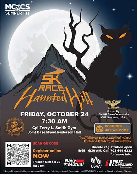 Haunted Hill 5K Race Friday, October 24 • 7:30 am • Cpl Terry L Smith Gym, Henderson Hall. The 2025 OohRah Run Series at Henderson Hall is proudly hosting the 2025 Haunted Hill 5K. The race will begin across from Terry L. Smith Gym and take runners through all of the sights of Joint Base Myer/ Henderson Hall and end back at Smith Gym for our Post Race Awards Ceremony. The first 100 ticket holders are eligible to receive a Free race T-Shirt. T Shirts first come first served on race morning. Registered participants are eligible to compete for our top awards. Top 3 in the Male/Female divisions 14 years and up will receive a medal. Top 3 in 50+ Male/ Female will receive a medal. Top 3 in the youth division 13 and under will receive a trophy. This year participants will be eligible for the award in the category they register. On- site registration will be available the day of the race from 5:45 to 6:45 am. Costumes are welcome! This Halloween themed event will include tricks and treats for all participants! The Haunted Hill 5K Race is hosted by JBM-HH Base Commander On Behalf of Marine Corps Community Services & Semper Fit we welcome you to be a part of our healthy lifestyle events and compete with your fellow friends, family and Service Members! • Check-in and late registration on site starting at 5:45 am. Register here by October 21, 2025