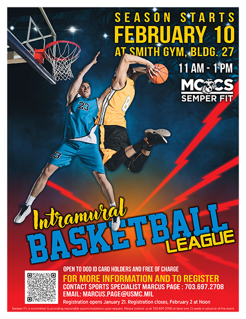 Semper Fit Athletics sponsors an Intramural Basketball League starting February 10, 2026. Games will be played select weekdays at CPL Terry L. Smith Gym at Henderson Hall Field from 11:00am to 1:00pm.
